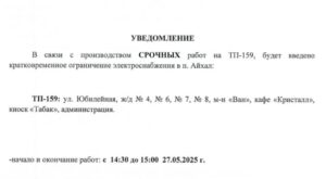 В связи со срочными работами на трансформаторной подстанции ТП-159 завтра, 27 мая 2025 года, будет введено кратковременное ограничение электроснабжения: ⏰ Время отключения: с 14:30 до 15:00 📍 Зона отключения: ✔ ул. Юбилейная ✔ Жилые дома № 4, 6, 7, 8 ✔ Магазин «Ван» ✔ Кафе «Кристалл» ✔ Киоск «Табак» ✔ Администрация Информация АРЭС